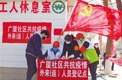 甘肃省酒泉市广厦社区党员干部在管控点对收支职员举行挂号。侯崇慧摄(人民视觉)