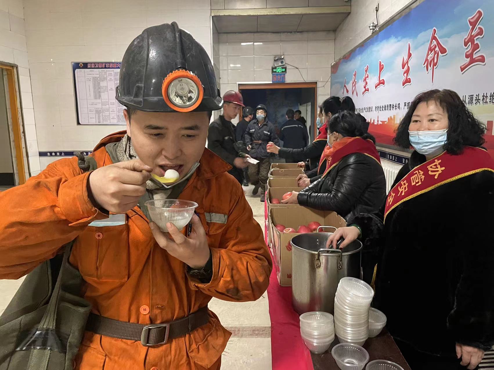 ¡°Ê¦¸µ£¬ÄúÐÁÇÚÁË£¡À´³ÔÍëÌÀÔ²£¬×£ÄúÔªÏü½Ú¿ìÀÖ£¡¡±¡°½ñÌìÊÇÔªÏü½Ú£¬ÎªÁË¿óɽµÄÇå¾²Éú²ú£¬ÄúÃÇÈÔÈ»¼áÊØÔÚÒ»Ïߣ¬Ð»Ð»ÄúÃǵÄÐÁÇÚÖ§¸¶£¬ÊÂÇéÖÐÒ»¶¨Òª°´ÕÂ×÷Òµ£¬È·±£Çå¾²Éú²ú¡¡¡±2ÔÂ15ÈÕÉÏÎ磬ÕâÊÇа²¿óÅ®¹¤¾ìÊôйÜÔ±¼°¹¤»áÊÂÇéÖ°Ô±ÔÚÈë¾®³¤ÀÈΪµ±°àÖ°¹¤ËÍÈ¥ÏóÕ÷ÍÅÍÅÔ²Ô²µÄÌÀÔ²ºÍÇå¾²Öö¸ÀʱµÄÒ»¸öůÐÄ»Ãæ¡£