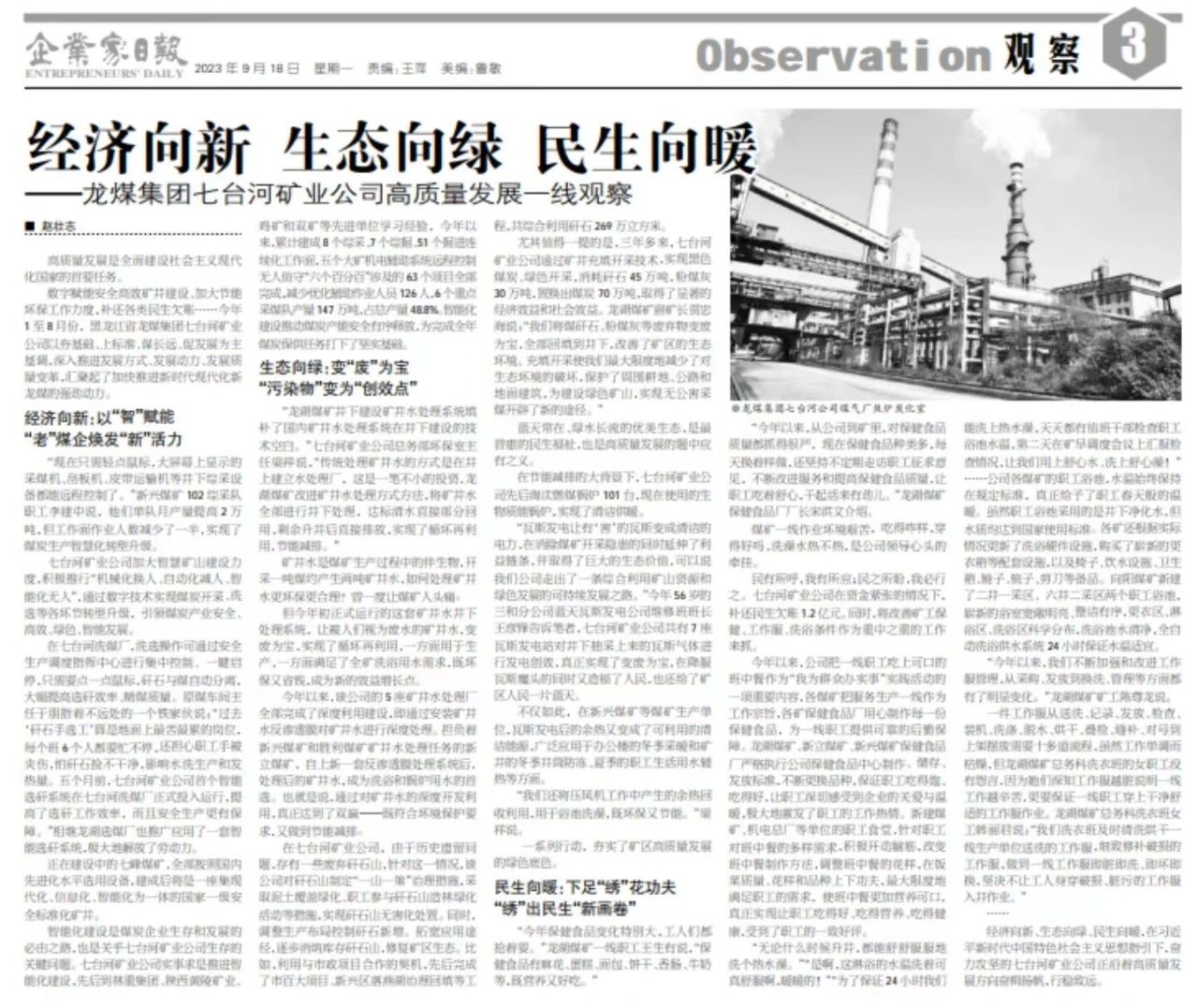 ¡°Íß˹·¢µçÈÃÓС®º¦¡¯µÄÍß˹Äð³ÉÇå½àµÄµçÁ¦£¬ÔÚÏû³ýú¿ó¿ª²ÉÒþ»¼µÄͬʱÑÓÉìÁËÀûÒæÁ´Ìõ£¬²¢È¡µÃÁËÖØ´óµÄÉú̬¼ÛÖµ£¬¿ÉÒÔ˵ÎÒÃǹ«Ë¾×ß³öÁËÒ»Ìõ×ÛºÏʹÓÿóɽ×ÊÔ´ºÍÂÌÉ«Éú³¤µÄ¿ÉÒ»Á¬Éú³¤Ö®Â·¡£¡±½ñÄê56ËêµÄÈýºÍ·Ö¹«Ë¾À¶ÌìÍß˹·¢µç¹«Ë¾Î¬ÐÞ°à°à³¤ÍõÑå·æ¸æËß±ÊÕߣ¬Æß̨ºÓ¿óÒµ¹«Ë¾¹²ÓÐ7×ùÍß˹·¢µçÕ¾¶Ô¾®Ï³é²ÉÉÏÀ´µÄÍßË¹ÆøÌå¾ÙÐз¢µç´´Ð§£¬ÕæÕýʵÏÖÁ˱ä·ÏΪ±¦£¬ÔÚսʤÍß˹ħͷµÄͬʱÓÖÔ츣ÁËÈËÃñ£¬Ò²»¹¸øÁË¿óÇøÈËÃñһƬÀ¶Ìì¡£