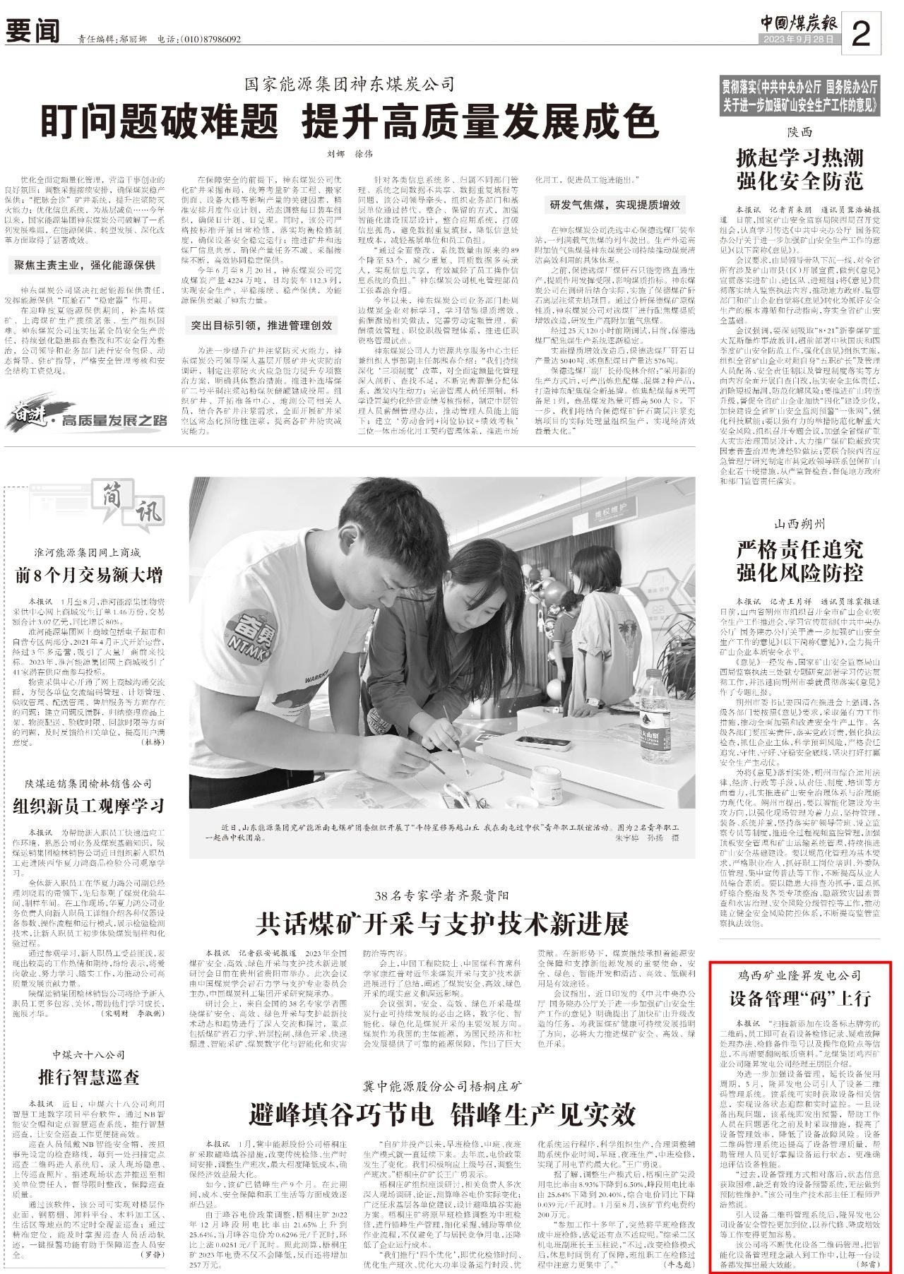 2023年9月28日,《中国煤炭报》对鸡西矿业公司引入装备二维码治理系统举行报道。