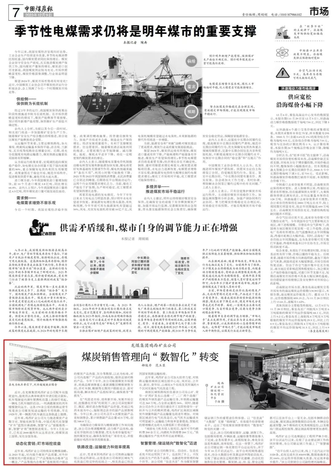 鸡西矿业公司的数字化、自动化、信息化系统不但应用到了井下,也送到了井上,不但活跃在生产的各个流程,也融进谋划治理的每个环节。该公司将“信息共享”作为煤炭智慧储运销事情的主要途径和行动,以“信息流”“大数据”支持“指挥链”,有用提升谋划治理水平,迈出了古板煤炭销售治理向“数智化”转变的要害一步。
