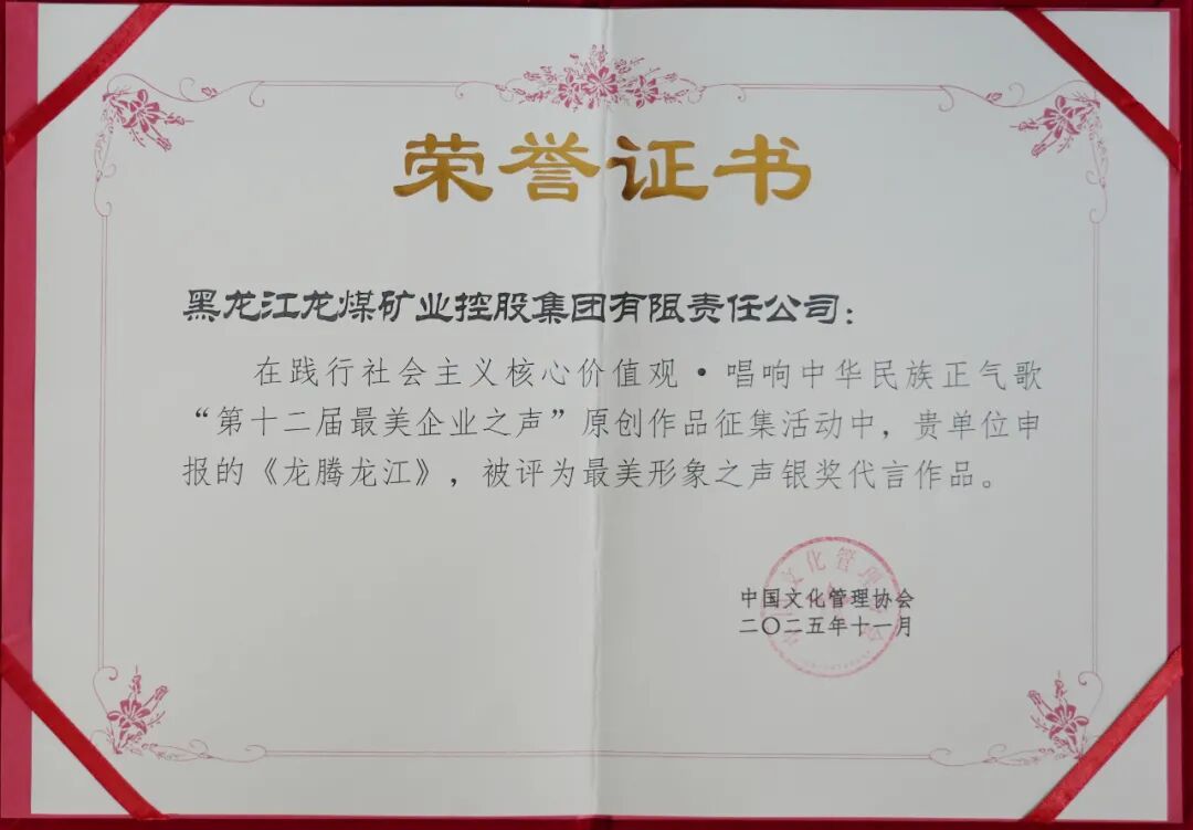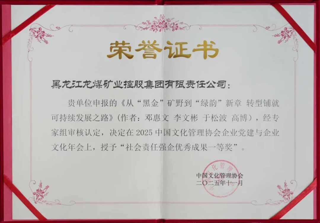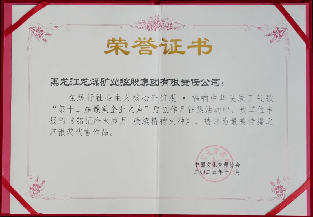 由黑龙江AG手机版官网集团申报的《从“黑金”矿野到“绿韵”新章 转型铺就可一连生长之路》被评为社会责任强企优异效果一等奖,原创作品《龙腾龙江》《铭刻狼烟岁月 赓续精神火种》分获最美企业之声展演银奖作品。别的,AG手机版官网集团还荣获“2025年度新时代企业文化建设五星单位”“2025年度优异组织单位”等多项殊荣。