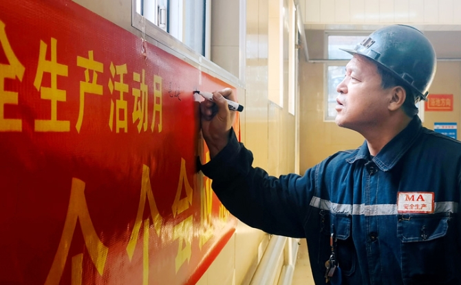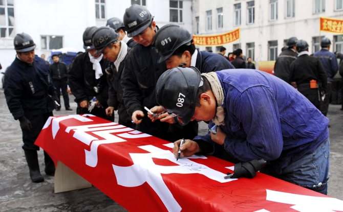 东山矿职工在清静生产允许条幅上署名。 李雪摄
